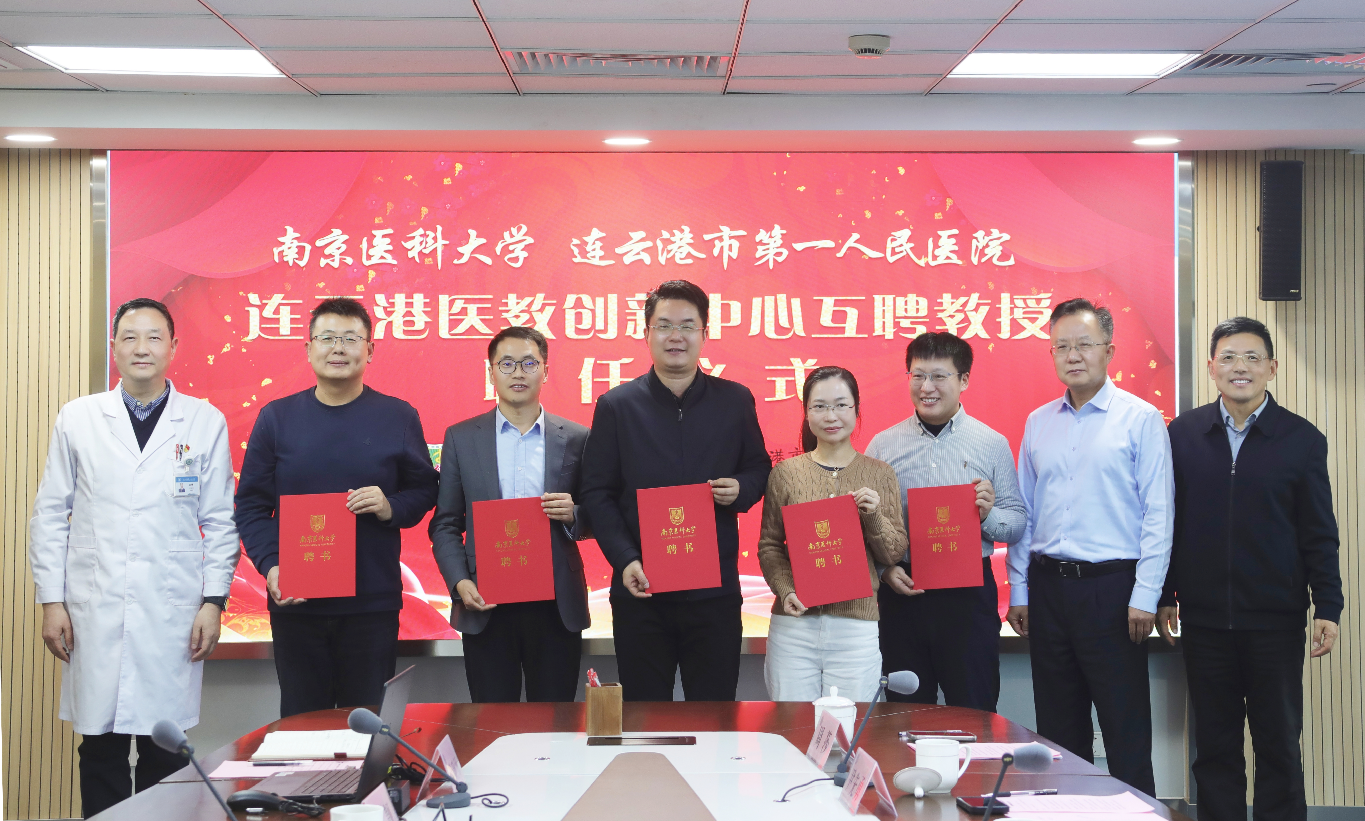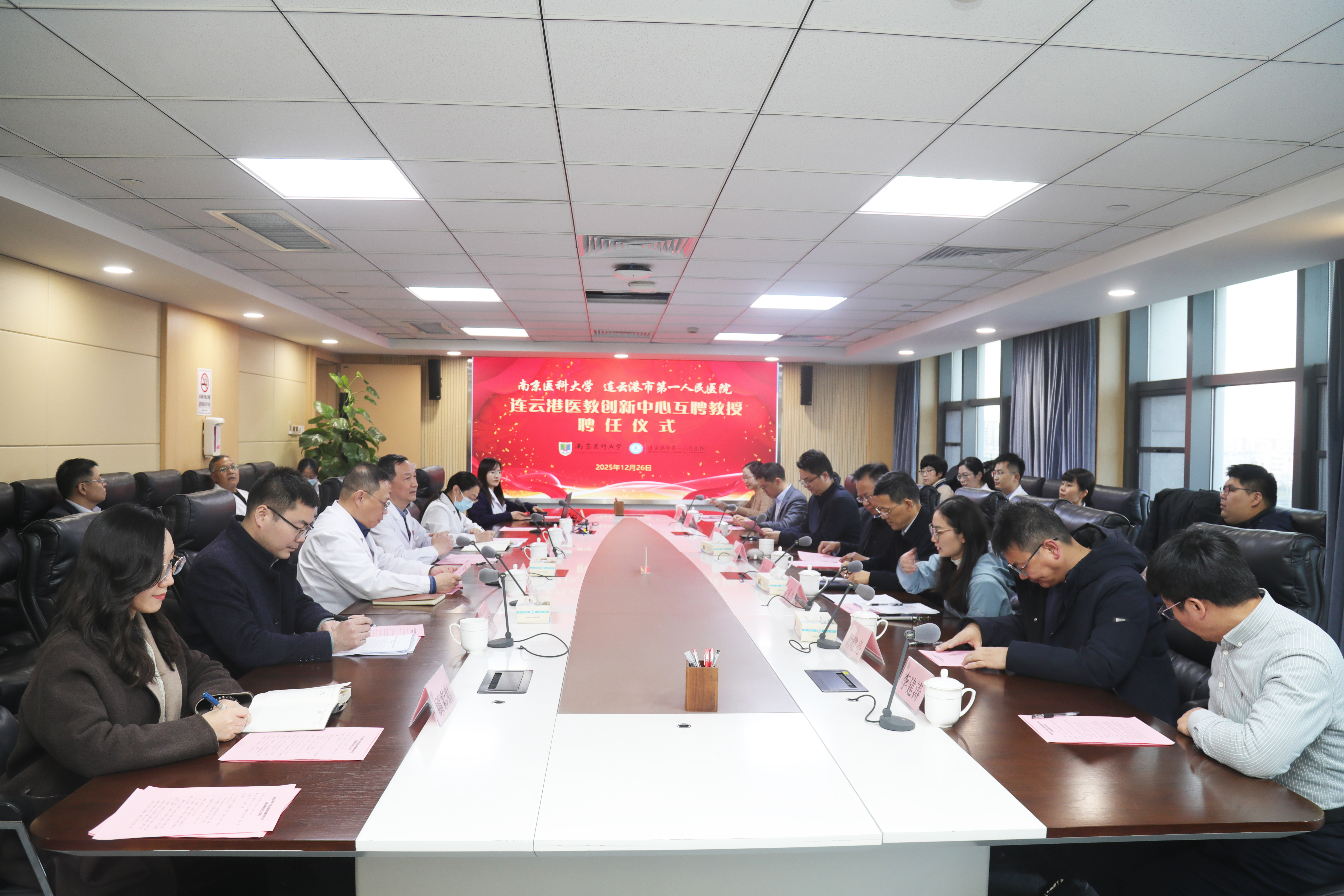 2025年12月26日,南京医科大学连云港医教创新研究中心互聘教授聘任仪式在连云港市第一人民医院高新院区成功举办。南京医科大学党委常委、副校长沈历宗,康达学院院长张鸿来,研究生院副院长徐志鹏,人事处师资师德科科长孟凡力和5位互聘教授;连云港市第一人民医院党委书记、院长施辉,副院长胡蓉、孙勇及双方相关科室负责人、科研骨干出席活动。